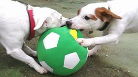 Janis e Carlitos, mãe e filho da raça Jack Russel, castanhos e brancos